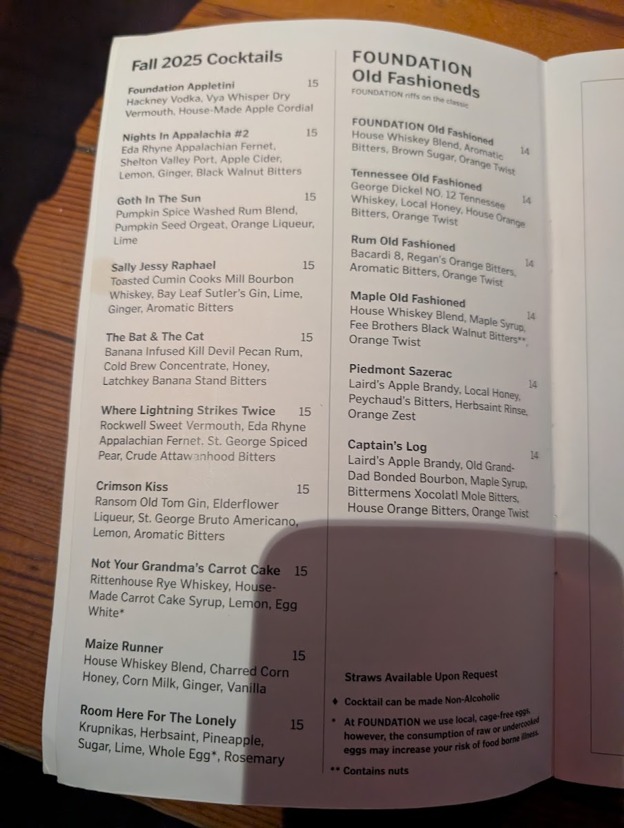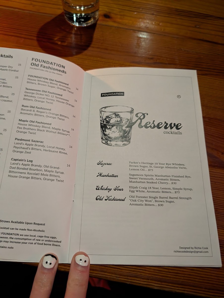 The menu at FOUNDATION offers a thoughtfully curated selection of cocktails and drinks that resonate with its intimate, below-street-level atmosphere. You'll find a range that leans into classic whiskey cocktails like their Tennessee Old Fashioned and Piedmont Sazerac, alongside refreshing choices such as the Mojito and Pisco Sour. This mix of timeless and contemporary drinks suits moments when you want to unwind with friends or enjoy a quieter evening out.